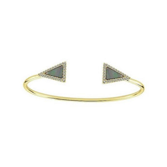 Gabriel & Co 14k yellow gold black mother of pearl and diamond polished cuff bangle. Striking inlay of black mother of pearl triangular shaped finials are highlighted by bead set diamonds finishing off this sleek bangle by Gabriel & Co.