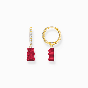 So sweet and deceptively real – but beware: do not nibble at it ;-) This single hoop earring is made of recycled silver with 18k gold plating, its highlight is the pendant in the shape of the HARIBO goldbears. It is made of high-quality, shatterproof, slightly satinised red crystal glass. The single hoop earring is set with white zirconia stones, and engraved with the lettering HARIBO and THOMAS SABO. This colourful, unique hoop earring reinterprets the famous gummy bear. This way, it brings back childhood memories and is the perfect accessory for your Y2K look. Combine the single hoop earring with further pieces of jewellery from our THOMAS SABO x HARIBO collection.