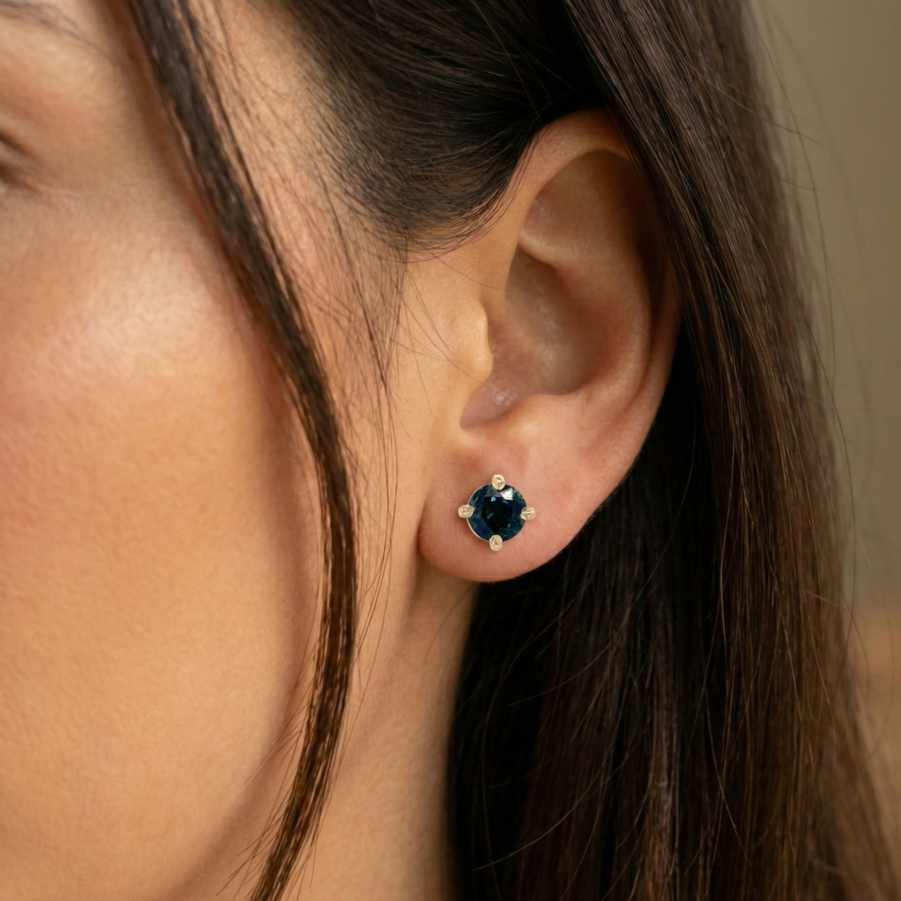 Beautiful teal sapphire studs, thoughtfully assembled in our Ottawa studio using estate sapphires given new life in 14K yellow gold settings. Each solitaire stud features a lively round-cut natural sapphire, approximately 5.0mm, with a combined total weight of approx. 1.20ctw. The gems display a captivating greenish-blue hue with a rich, medium-dark tone, secured with posts and butterfly backs. Teal sapphires, September’s birthstone, are celebrated for their distinctive colour and enduring appeal.