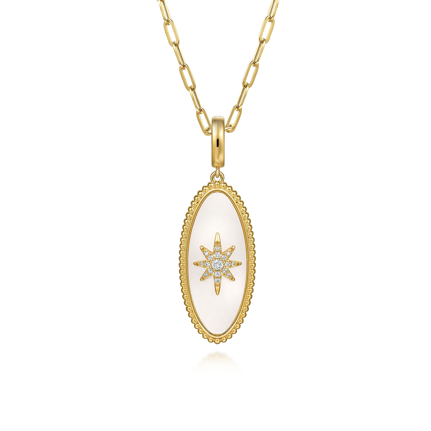 Gabriel & Co. 14K Yellow Gold Diamond and White Mother of Pearl Bujukan Oval Shape Medallion Pendant With Detachable Bail