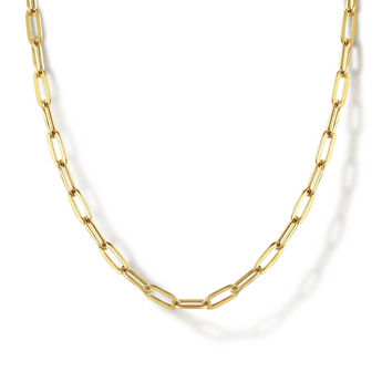 This Gabriel & Co, 14k yellow gold paper clip chain necklace sits perfectly at the collarbone, ideal for showcasing pendants or wearing as a standalone statement piece.