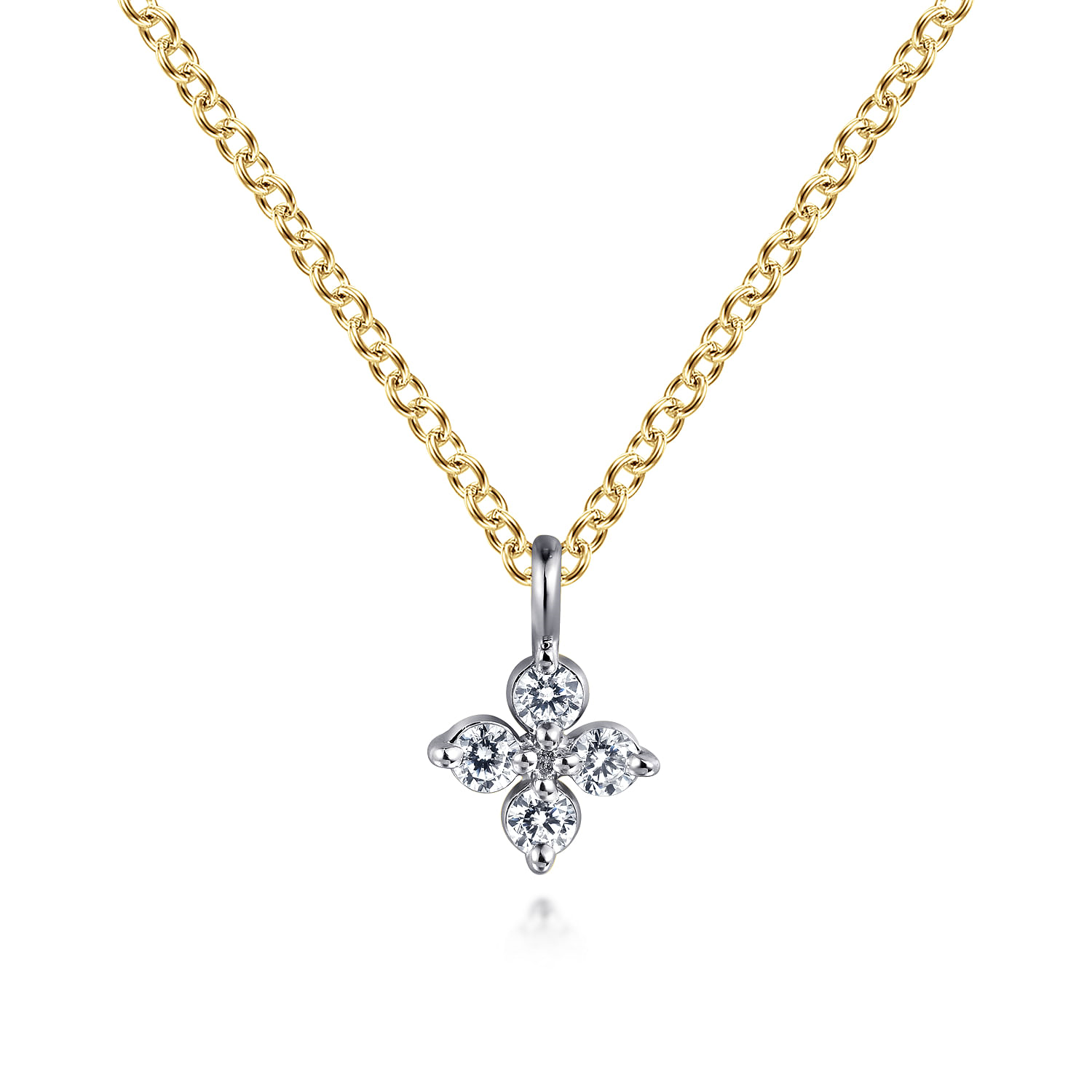 This dainty Gabriel & Co. pendant showcases a delicate flower design crafted in 14K yellow and white gold, combining warm and cool tones for sophisticated contrast. The piece features approximately 0.09 total carat weight of round brilliant natural diamonds graded SI+ clarity and GH color, offering excellent sparkle and brilliance.