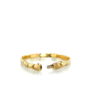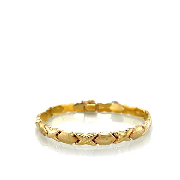 This timeless Italian bracelet brings effortless elegance to the wrist with its classic "XO" link design, a symbol of hugs and kisses. Crafted in 14K yellow gold, the polished X links gleam against the soft, brushed satin finish of the O links, creating a beautiful play of texture and light. Measuring approximately 8 inches in length and 7mm in width, it is secured with a box clasp and safety lock for peace of mind. Stamped ITALY, this piece reflects the unmistakable quality and refinement of fine Italian craftsmanship. Whether worn solo for a subtle statement or layered into your daily stack, it's a versatile and enduring favorite. Offered in very good vintage condition.