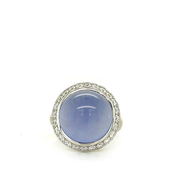 This estate 18K white gold ring is all about bold color and soft sparkle. At the center sits a luminous lavender chalcedony cabochon (approx. 15x15x8mm), glowing with a dreamy blue-violet hue and subtle chatoyancy that shifts in the light. It’s wrapped in a glittering halo of 25 round brilliant-cut diamonds (approx. 1.00ctw, SI-I clarity, GH color) for just the right amount of shimmer. The ring is a size 10 and has been re-sized, with a visible sizing bar at the back of the shank. Stamped 18K CEA and in very good condition, this ring is full of unique charm.