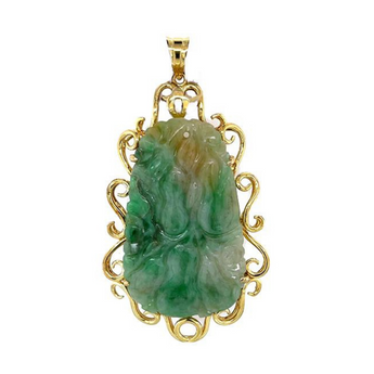 Estate 14K Yellow Gold Large Carved Jade Filigree Pendant