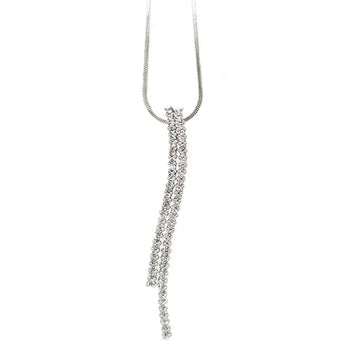 This slider pendant brings a striking, linear elegance to any look. Crafted in 14K white gold, it showcases two curved vertical bars lined with 57 round-cut diamonds in bead settings (approx. 0.85ctw total, I2). Measuring approximately 55mm long and 5mm wide, the pendant makes a bold, modern statement while remaining versatile enough for everyday wear. Kindly note the chain is not included.