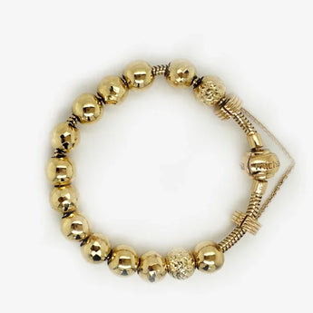 This stand-out bracelet from Michael Hill features a 3mm 10K yellow gold snake chain measuring approximately 7.5 inches long, secured with a barrel snap clasp and fitted with a safety chain with stopper beads to keep everything perfectly in place. It is adorned with fourteen 10K gold beads, each measuring about 9–9.5mm, all stamped Michael Hill 10K, catching the light with every move. In excellent pre-owned condition, this piece is ideal for anyone who loves the look of charm jewelry but also appreciates the weight and warmth of real gold.