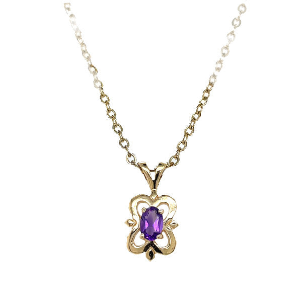 Unique vintage-style pendant crafted in warm 14K yellow gold, measuring approximately 19x10mm. At its center is an oval-cut natural amethyst (6x4mm) set within a floral cutout design. Amethyst, February’s birthstone, adds a touch of timeless colour to the piece. The pendant is in very good condition. Please note that a chain is not included.